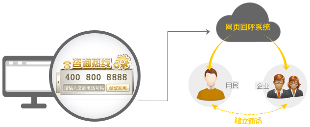 網(wǎng)民輸入電話號(hào)碼,回呼系統(tǒng)立即向”網(wǎng)民”和“企業(yè)”撥打電話,雙方接起即可溝通!
