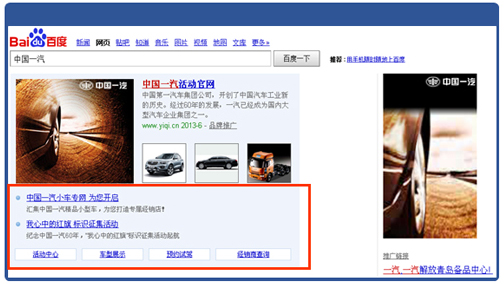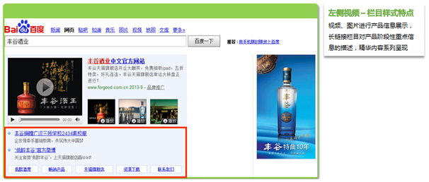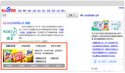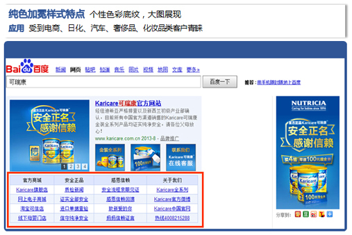 百度品牌專區(qū),位于百度搜索結(jié)果首位,以超大黃金首屏展示位置,以文字、圖片、視頻等多種廣告形式 全方位推廣展示企業(yè)品牌信息,將精華和直接的品牌信息展現(xiàn)在網(wǎng)民面前,眾多網(wǎng)民也得以更便捷的了 解品牌信息,更方便的獲取所需企業(yè)資訊,是提升企業(yè)品牌推廣效能的創(chuàng)新品牌推廣模式。